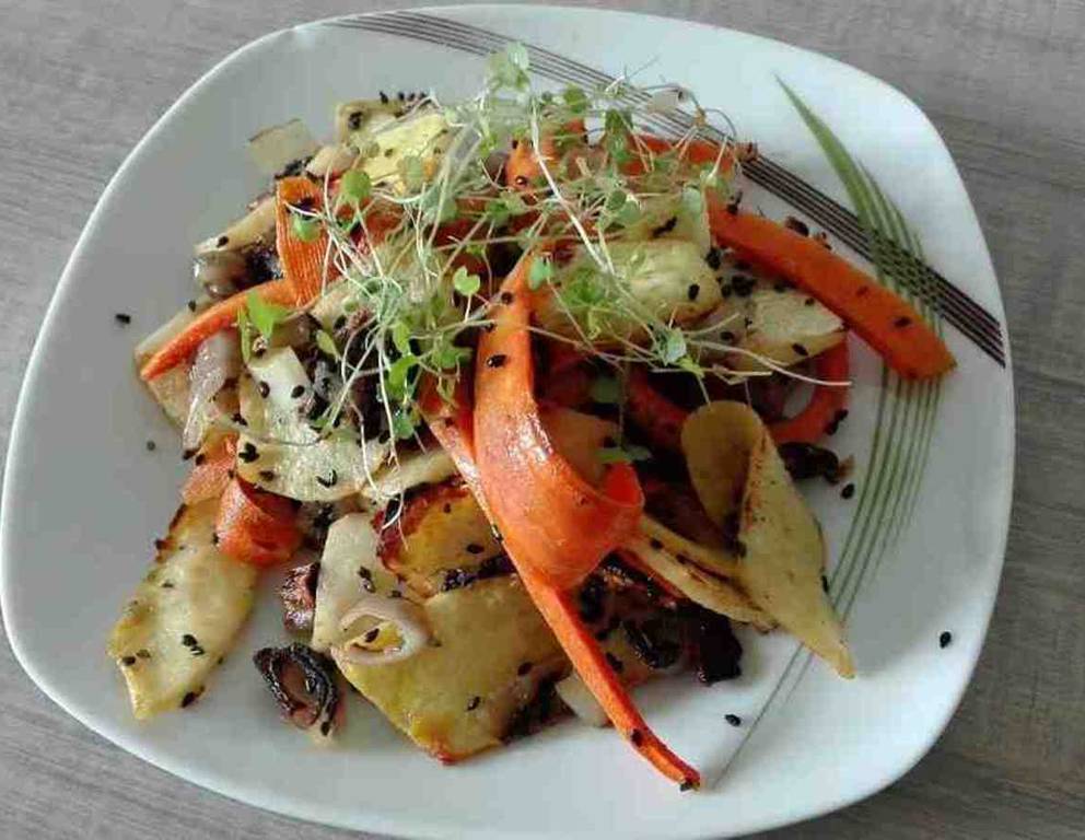 Die Sellerie-Karotten-Sesam-Pfanne passt perfekt zu rotem Fleisch, fernöstlichen Speisen oder ist auch einfach so genossen äußerst schmackhaft.