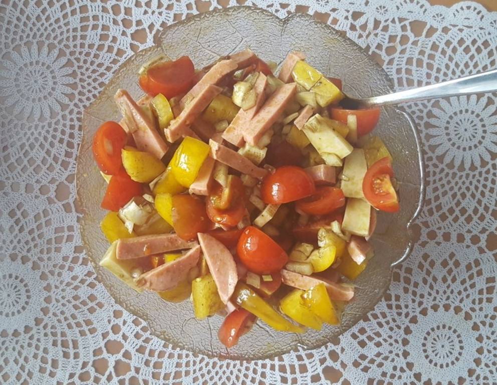 - Den Paprika halbieren, alle Kerne entfernen und den Paprika würfeln. Die Cocktailtomaten halbieren. Alles in eine Schüssel geben und den Wurst-Käse-Salat mit Kernöl, Apfelessig und Salz abschmecken.