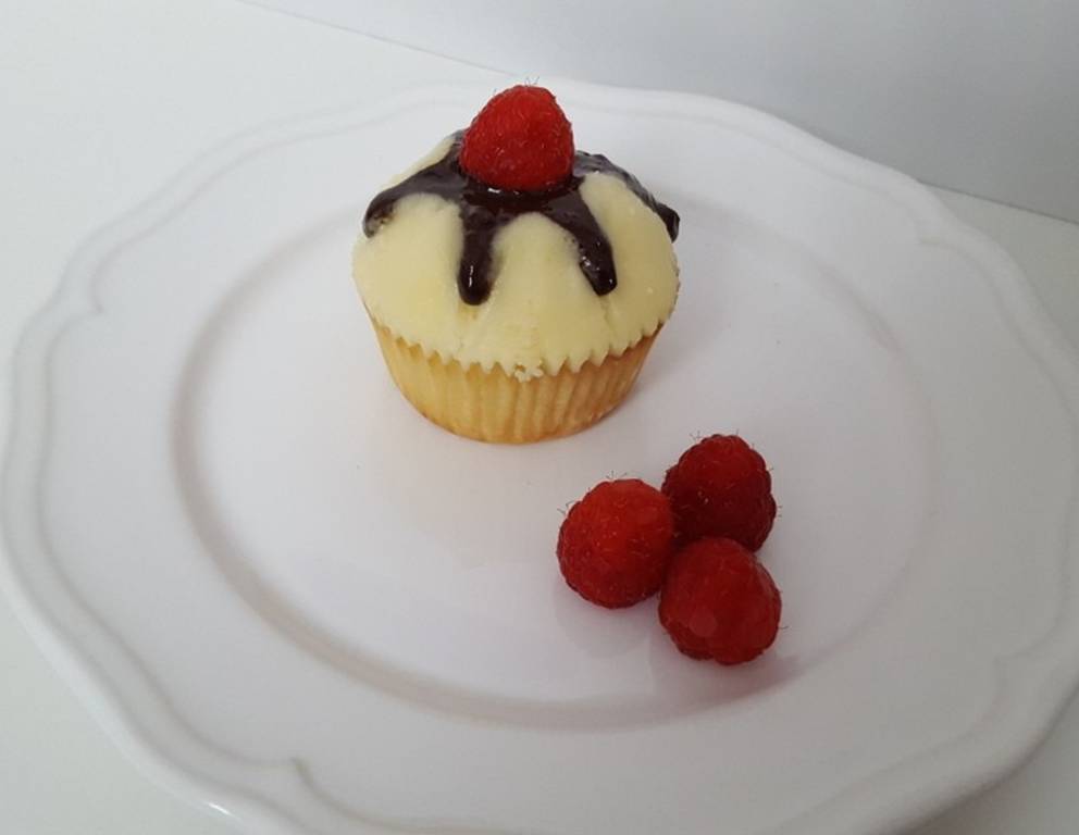 - Die Schokolade in einem Wasserbad schmelzen und auf dem Cupcakes verteilen. Eine Himbeere in die noch flüssige Schokolade drücken und die Cupcakes nochmals für einige Minuten kalt stellen.