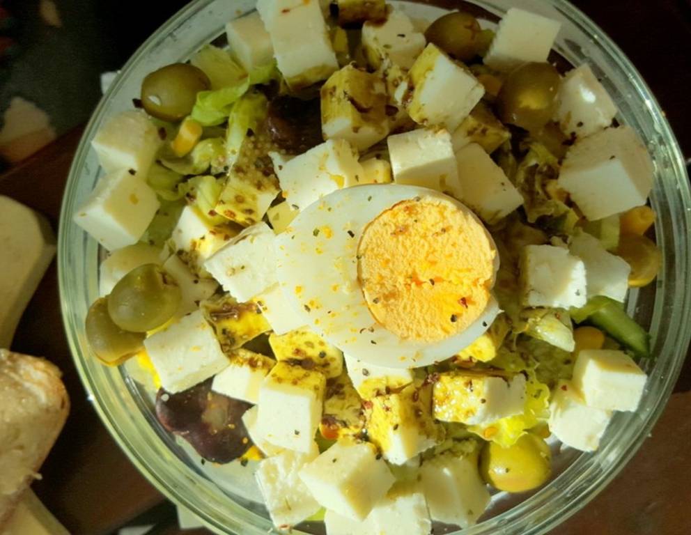Wer mag kann noch gepressten Knoblauch in den Schafskäsesalat geben.