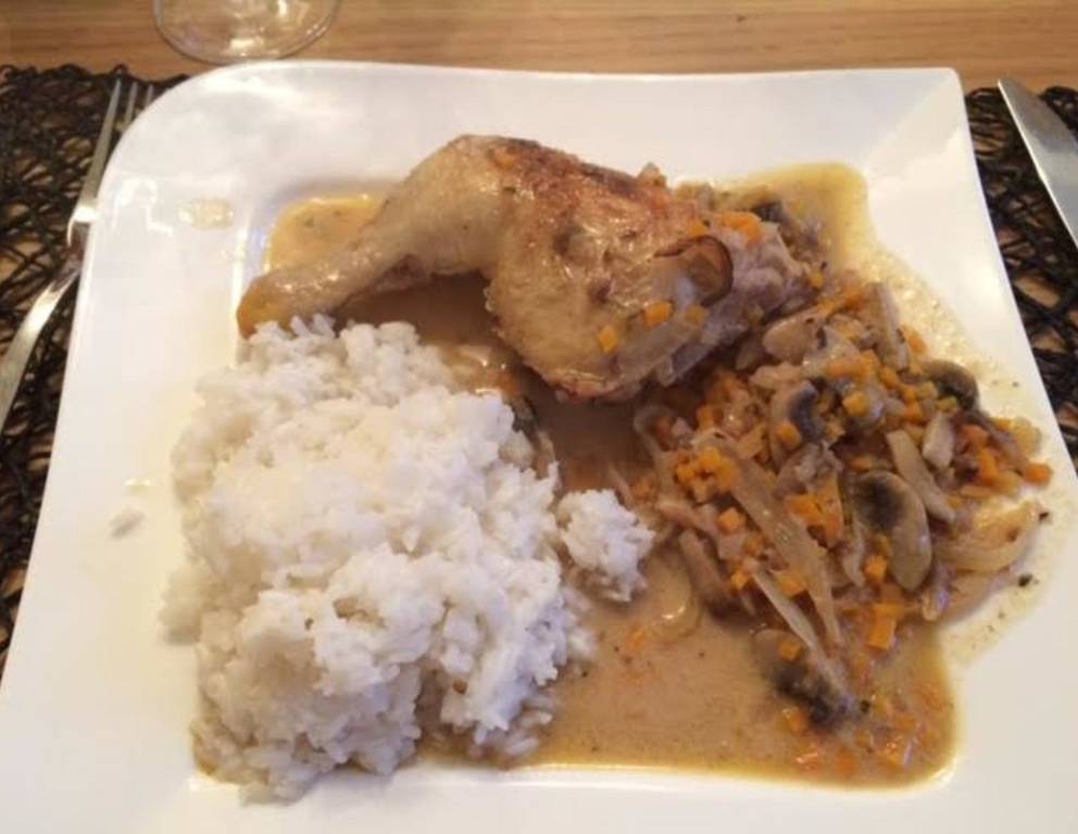 - Wenn die Hühnerkeulen im Weißweinsauce mit Karotten und Champignons insgesamt ca. 40 Minuten im Backrohr waren, herausnehmen und zum Beispiel mit Reis servieren.