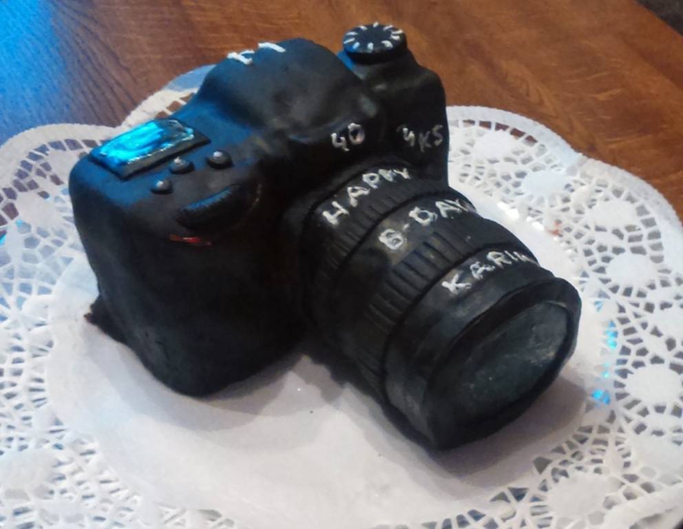 - Aus dem restlichen Fondant zusätzliche Streifen für das Objektiv, etc. zurechtschneiden bzw. kleine Kugeln für die Knöpfe formen. Die fertige Kameratorte mit Zuckerschrift verzieren.
