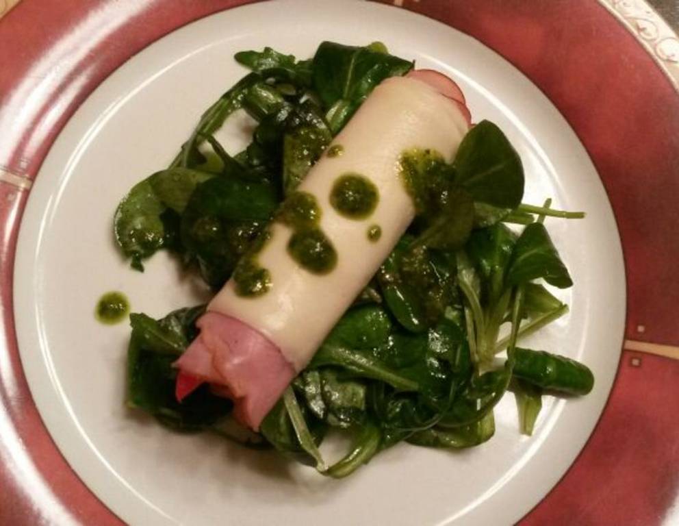 - Die Mozzarella Scheiben und Rohschinkenscheiben zusammenrollen und auf dem Salat platzieren.