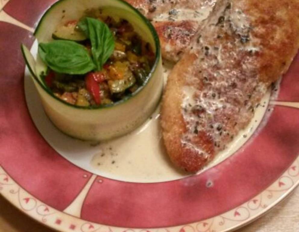- Den Knoblauch schälen, fein würfeln, zugeben und mit Salz und Pfeffer abschmecken. Einen Dessertring mit 2 Scheiben Zucchini auslegen und das Ratatouille einfüllen. Ring entfernen und mit einem Basilikumblatt garnieren.