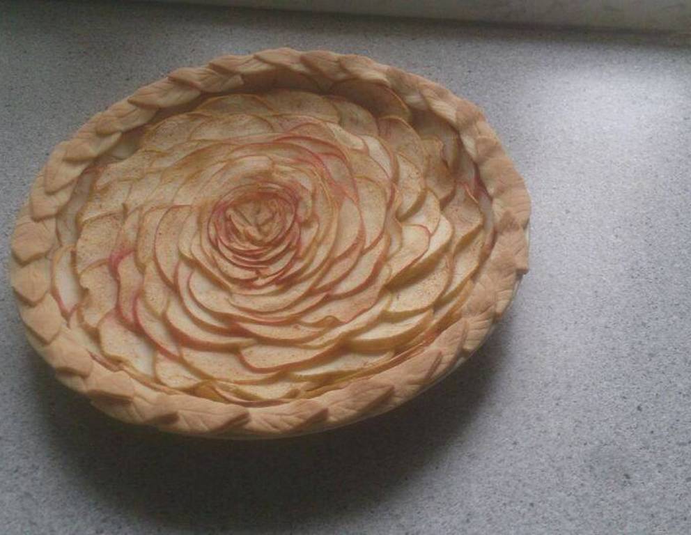 - Die Äpfel in dünne Scheiben schneiden und von außen nach innen zu einer Rose legen. Aus dem restlichen Mürbteig Blätter ausstechen/formen und auf den Rand der Tarteform geben.
