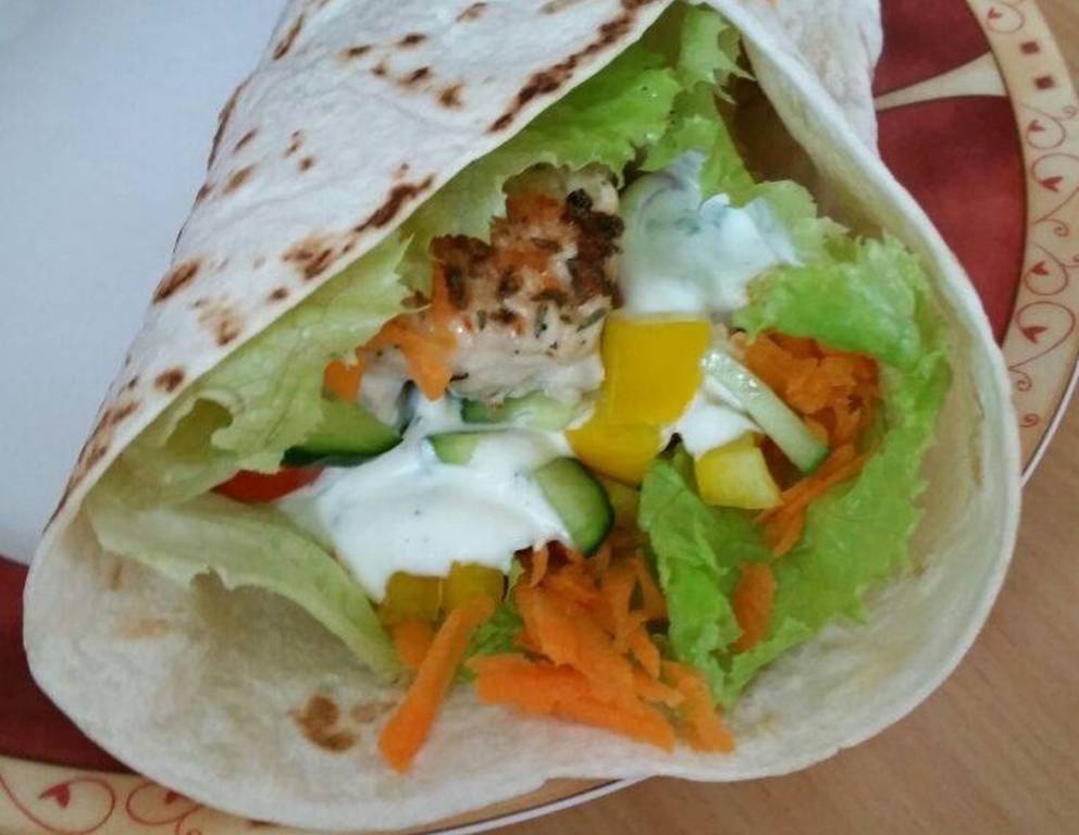 Den Hühner Wrap am besten unten einschlagen und dann erst seitlich einrollen, damit auf der Unterseite nichts rausfallen kann.
