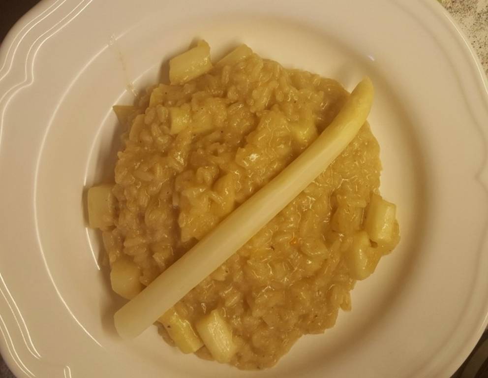 Wer möchte gibt noch frische Kräuter über das Spargelrisotto. Das Risotto lässt sich auch mit grünem Spargel zubereiten.