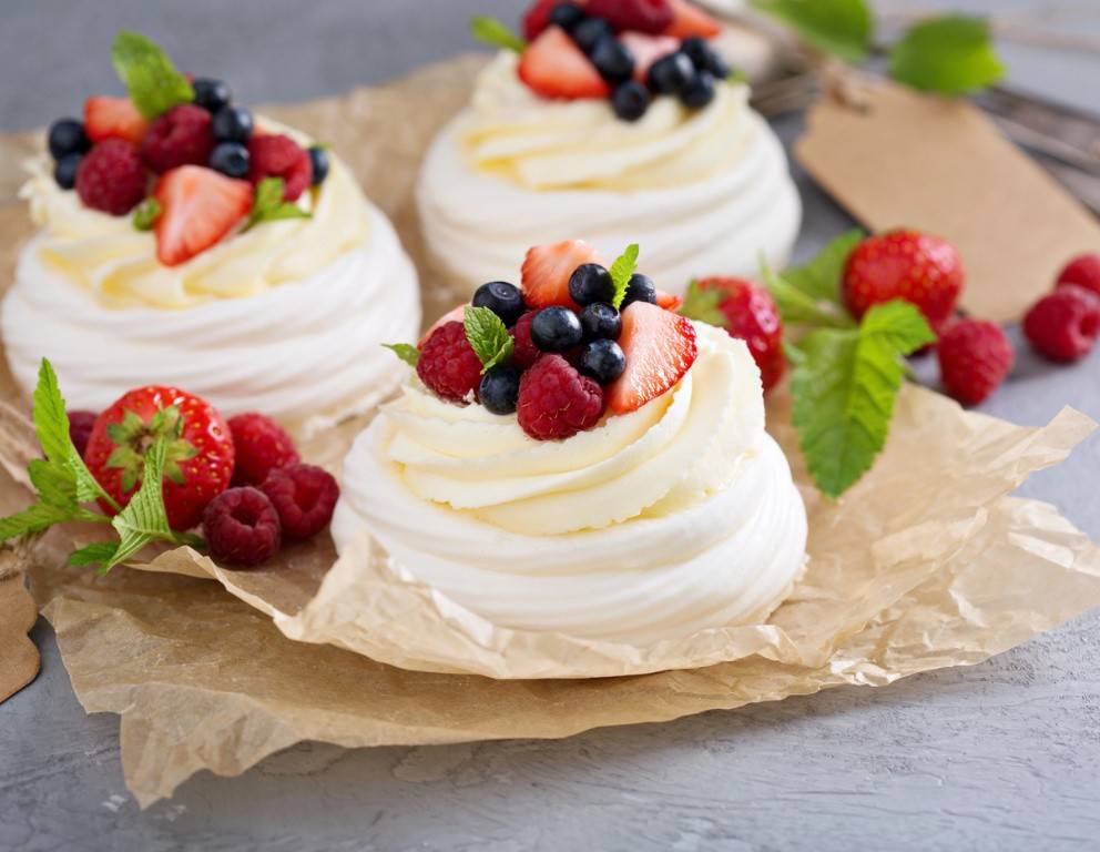 - Die gewaschenen Beeren trockentupfen, die Erdbeeren halbieren bzw. größere vierteln und auf der Creme verteilen. Mini-Pavlovas mit Beeren servieren.