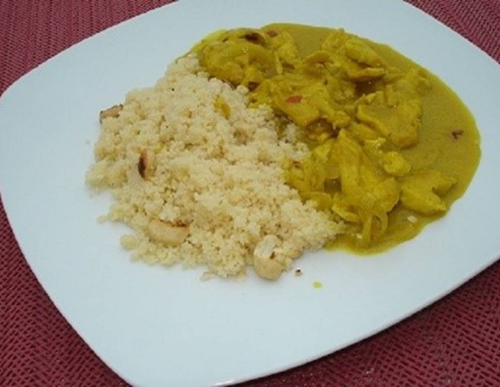 Wer mag, kann unter den Couscous gehacktes Koriandergrün unterziehen. Couscous mit Hühnercurry kann evt. auch mit Ananas zubereitet werden.