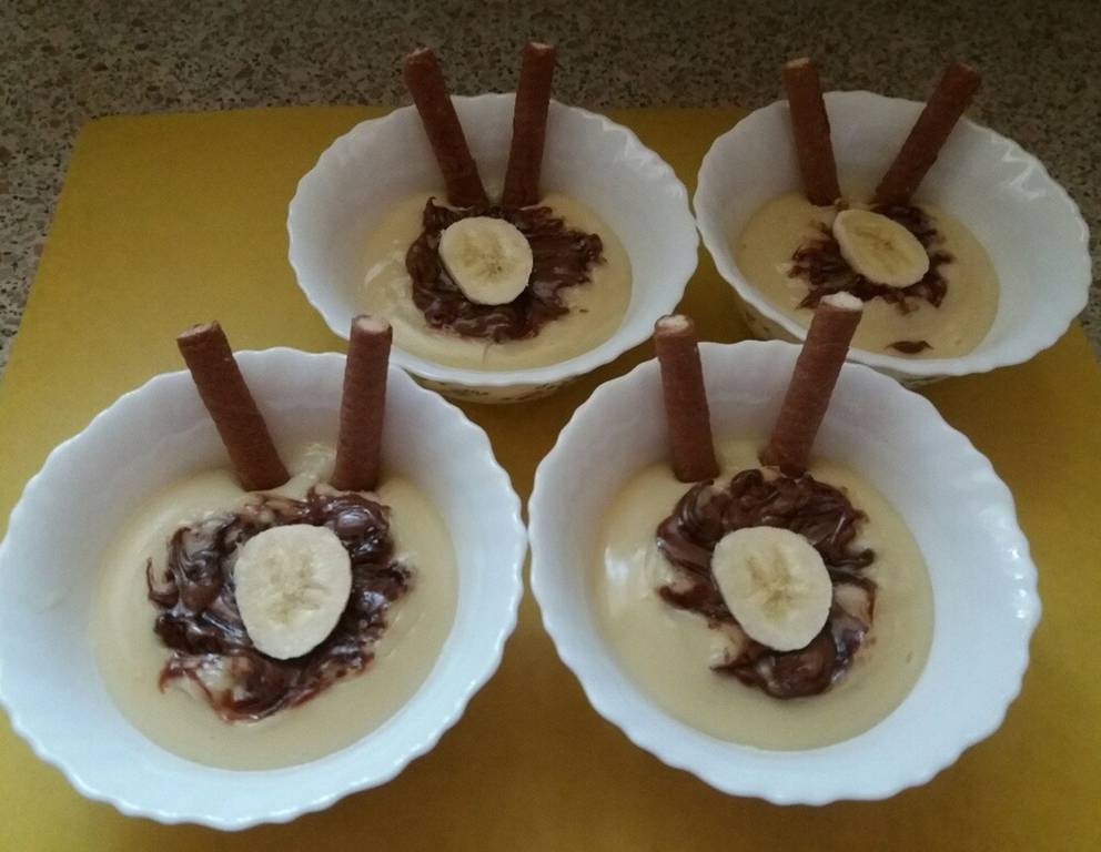 Man kann den Bananen-Nutella-Pudding auch in Förmchen füllen und nach dem Erkalten auf Teller stürzen und dann mit Bananenscheiben und Nutella garnieren.