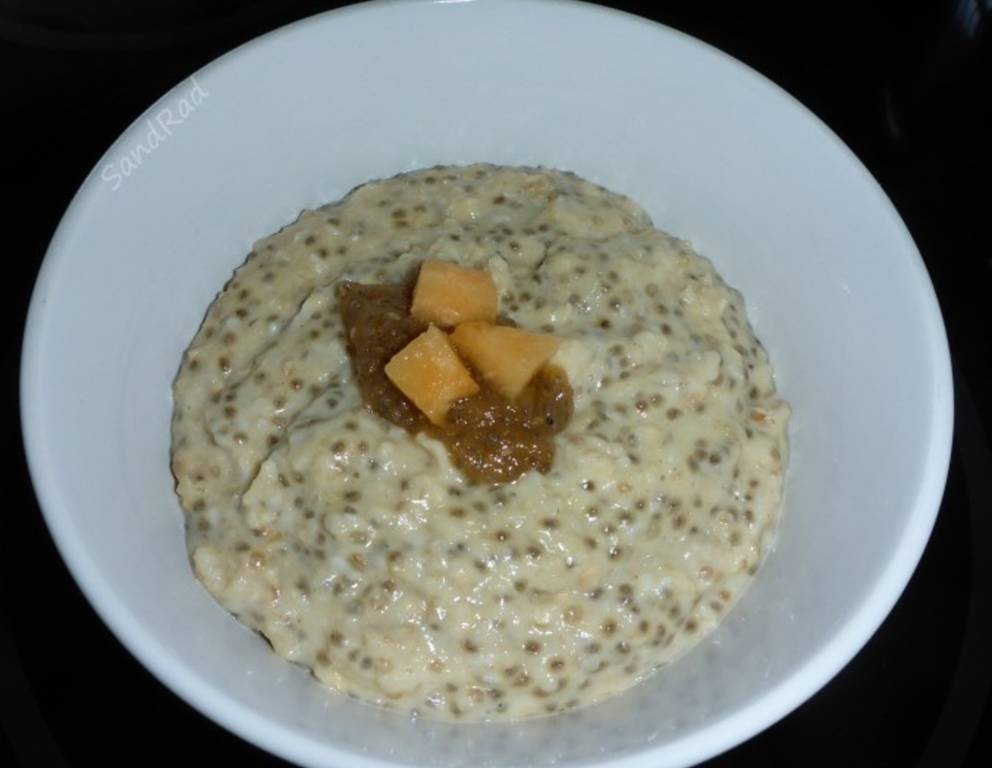 - Kokosblütenzucker und das Melonenmus mit Chia in den fertigen Porridge einrühren und nochmals kurz ziehen lassen. Ein paar Melonenstückchen oben draufsetzen.