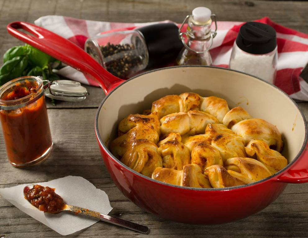 Zum Servieren die Pizzablume alla bolognese einfach mit den Fingern auseinanderzupfen. Perfekt für Parties!