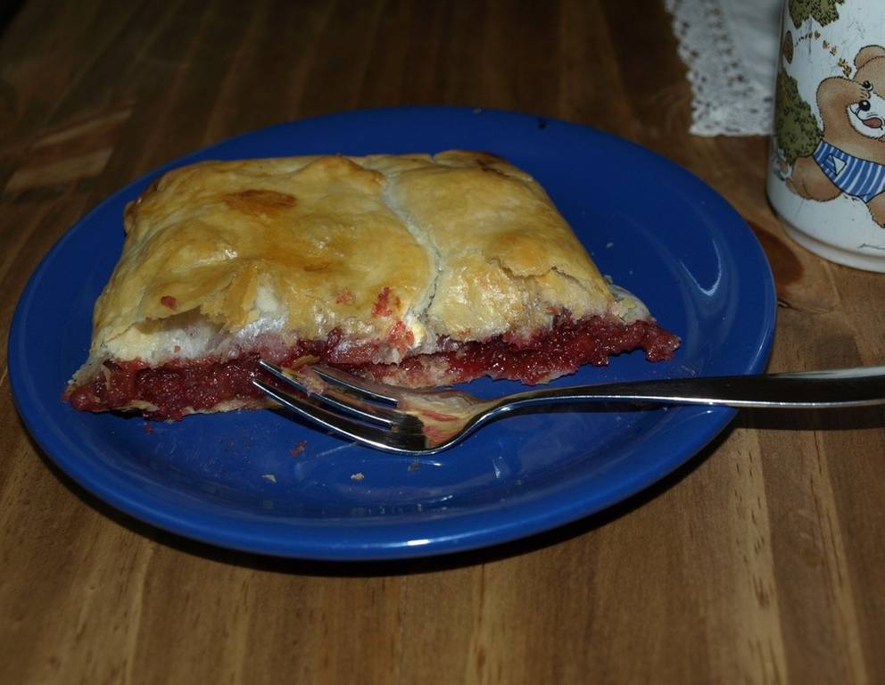 - Den Blätterteig ausrollen, mit der Weichselmasse füllen, zusammenschlagen und mit Milch bepinseln. Laut Anleitung backen.