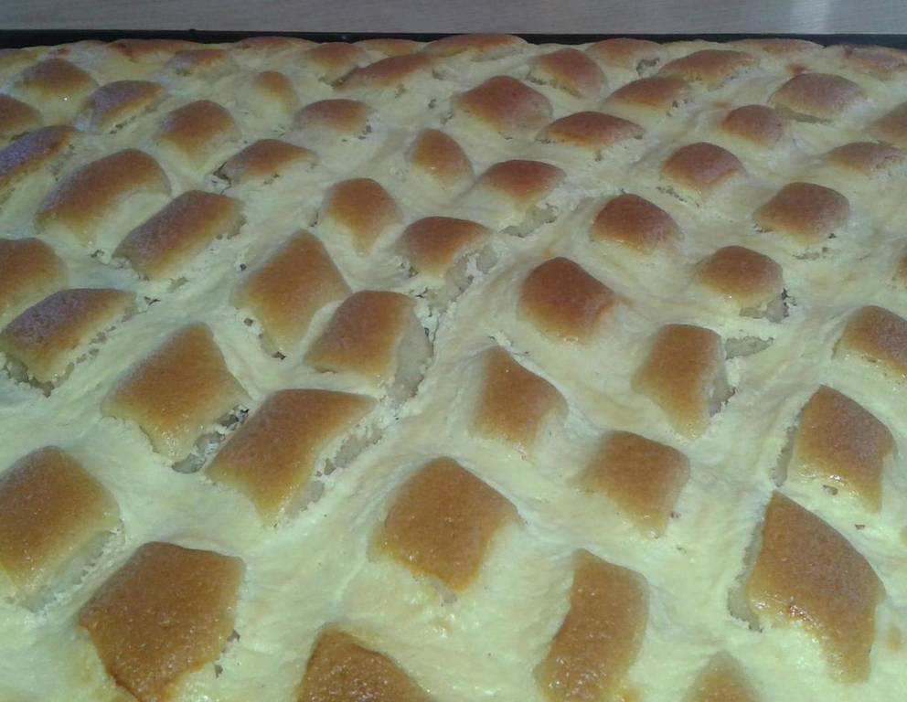 - Den Teig auf einem Backblech verteilen, die Topfenmasse in eine Spritztülle füllen und auf dem Teig mit der Masse gitternetzähnliche Linien ziehen.