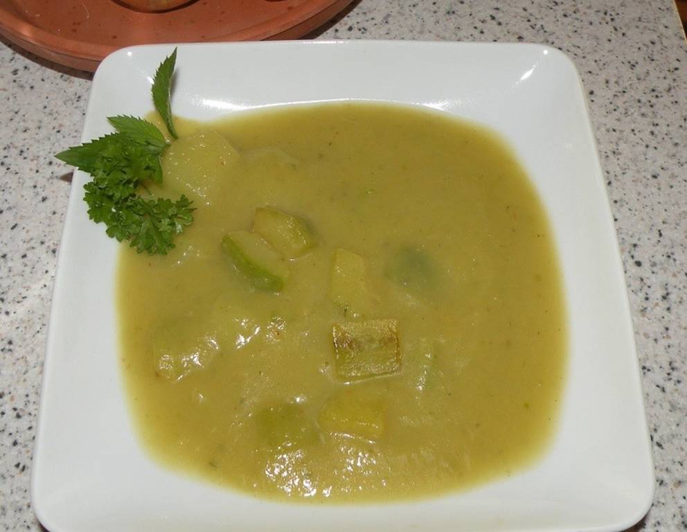 - Dann mit dem Wasser aufgießen, Suppenpulver, Pfeffer und Salz zugeben, wer mag noch Muskat. Alles etwa 10 min kochen, dann mit dem Pürierstab pürieren, aber einige Stücke Zucchini vorher wegnehmen und nachher wieder in die Suppe geben.