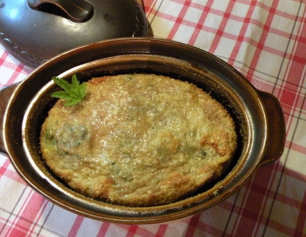 - Ausgedrückte Gemüseblätter dazu mischen. Schnee unterheben. Eine Backform ausbuttern und ausbröseln, Masse einfüllen.