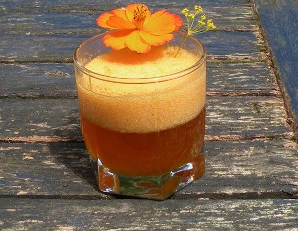 - Auf vier schöne Glaser aufteilen. Eiweiß sehr steif schlagen und die Marillenmarmelade unterziehen, diesen Schaum vorsichtig auf das Gelee geben und mit essbaren Blüten schmücken.