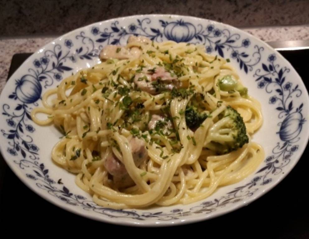 - Knoblauch und Brokkoli hinzugeben und noch etwas andünsten lassen. Die Milch, den Parmesan und die bereits vorgekochten Spaghetti hinzugeben und dünsten lassen bis die Sauce schön cremig ist.