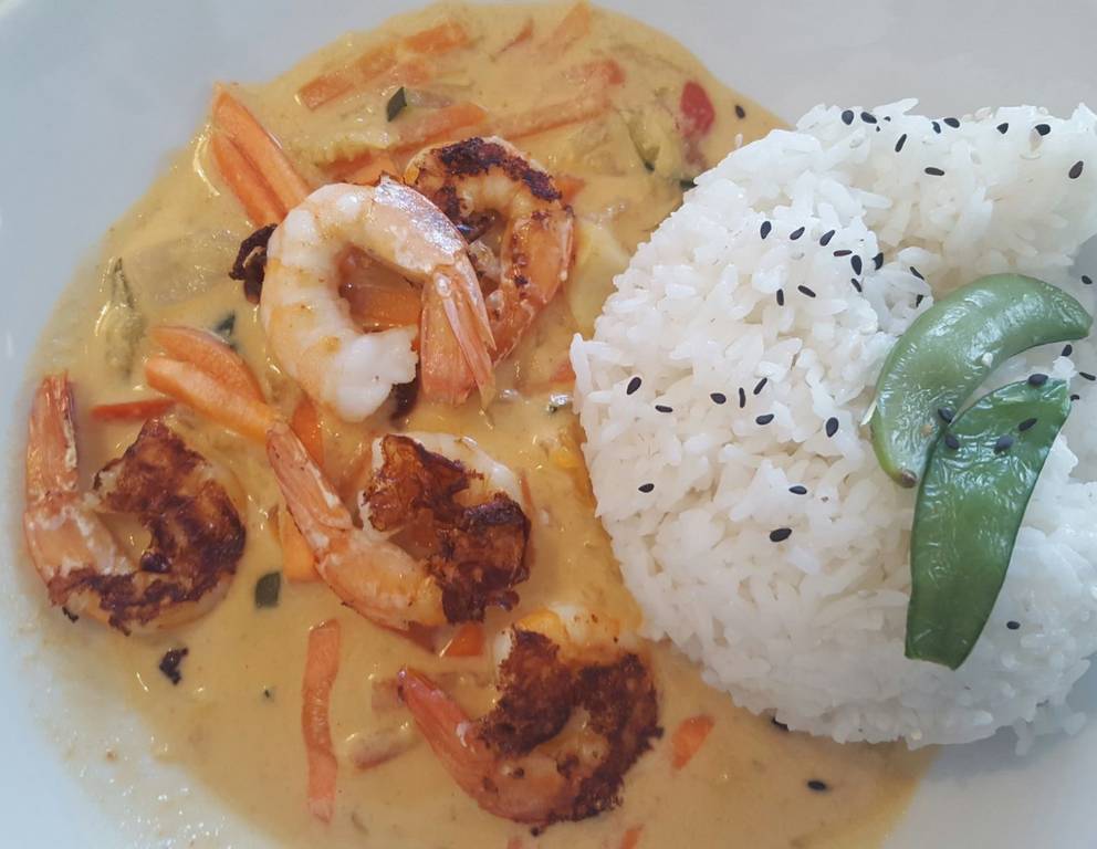Die Shrimps mit Erdnussbuttersauce am besten mit Basmatireis servieren. Das ergibt eine feine geschmackliche Kombination.