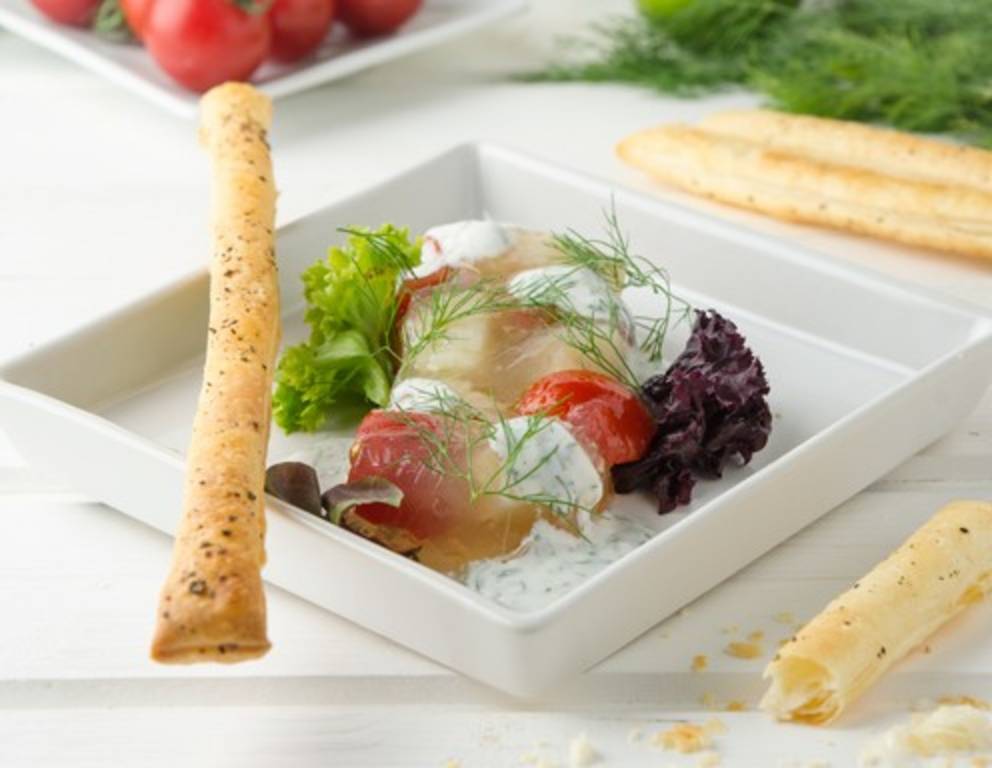 Gesulztes Ceviche mit Dilljoghurt und Pfeffersticks am besten mit Weißbrot oder Toast servieren.