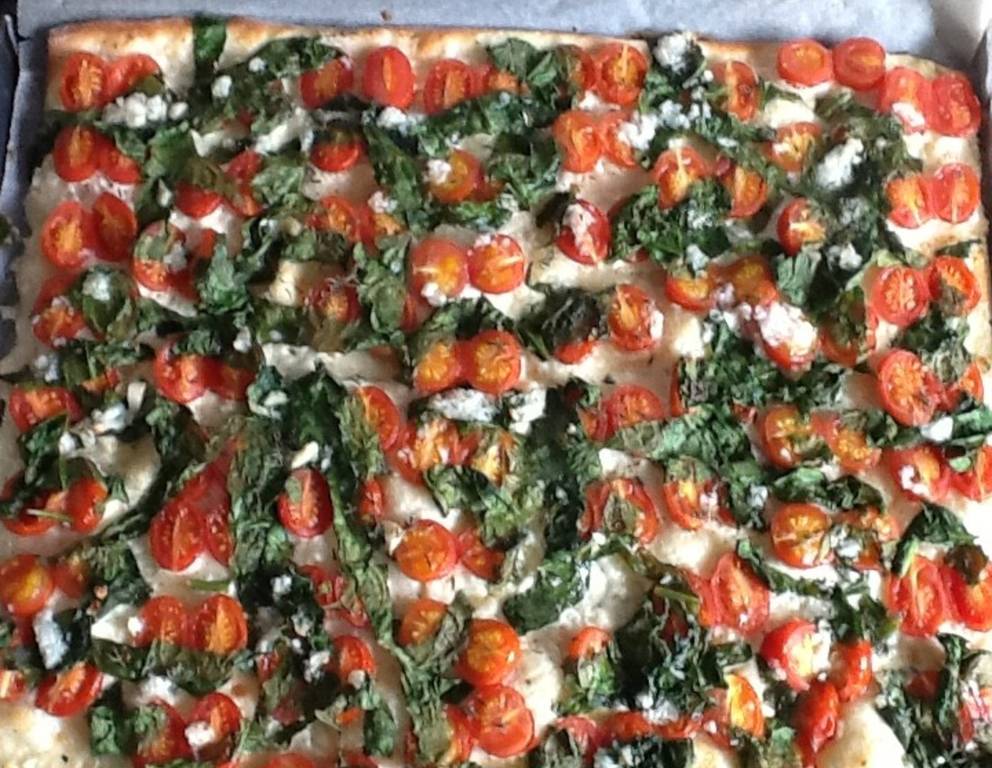 - Den Teig hauchdünn ausrollen. Creme fraiche mit etwas Knoblauchöl, Thymian und Salz abschmecken, auf den Teig streichen. Mit den Paradeisern belegen.