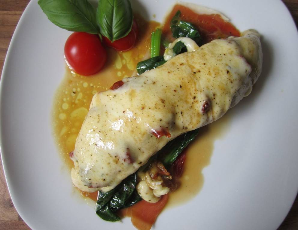 Gefüllte Hühnerbrustfächer auf Blattspinat kann man beliebig auch mit anderem Käse überbacken.