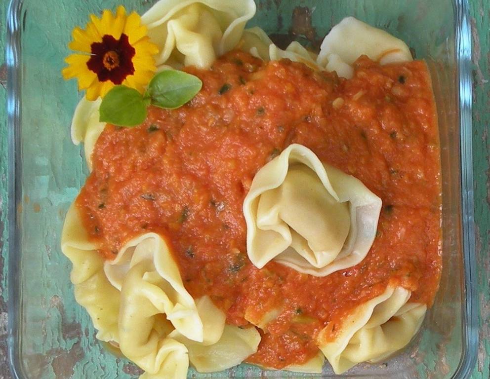 Die Tortellini mit Gemüsesoße am Schluss noch direkt bei Tisch eventuell mit gehobeltem Parmesan bestreuen. Wer Zeit und Lust hat, macht den Nudelteig selbst. Statt der Käse-Basilikum Füllung ist auch jede andere Füllung nach Geschmack passend.