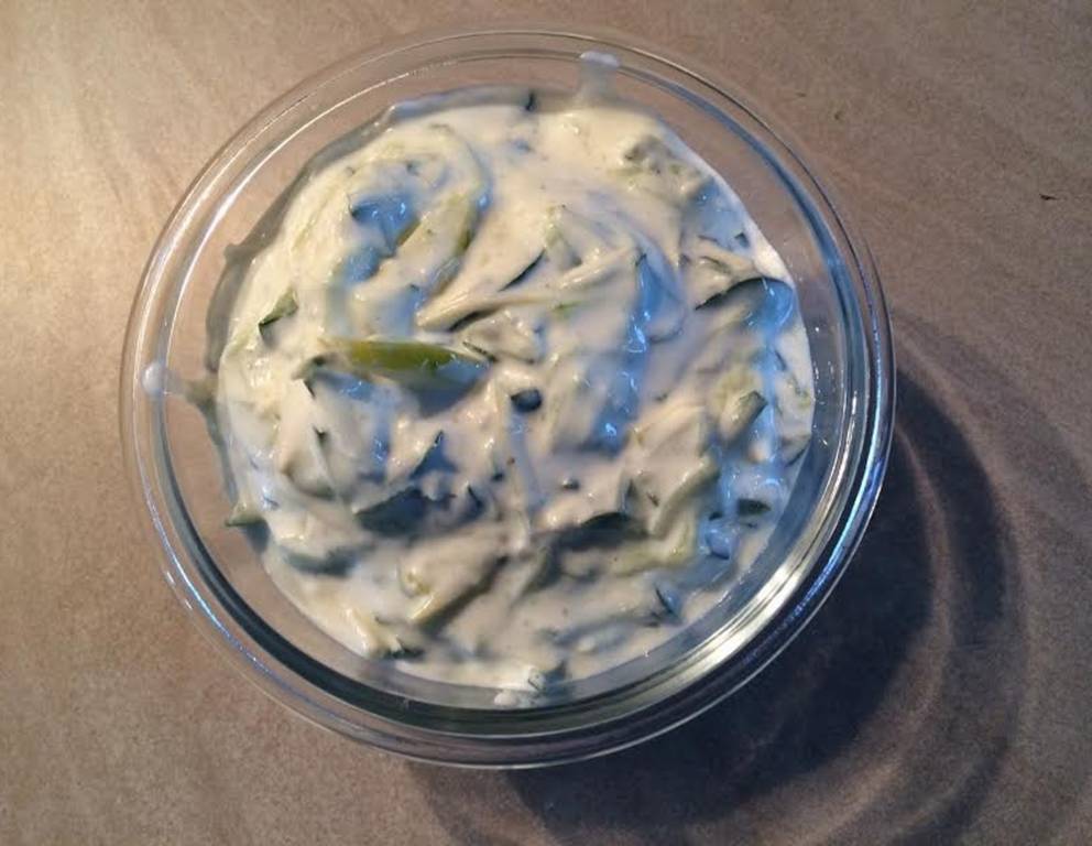 - Nun die Gurke ausdrücken und die Apfelstifte mit dem Saft untermengen. Die Knoblauchzehen pressen und mit dem Griechischen Joghurt und dem Sauerrahm zu Gurke und Apfel rühren.