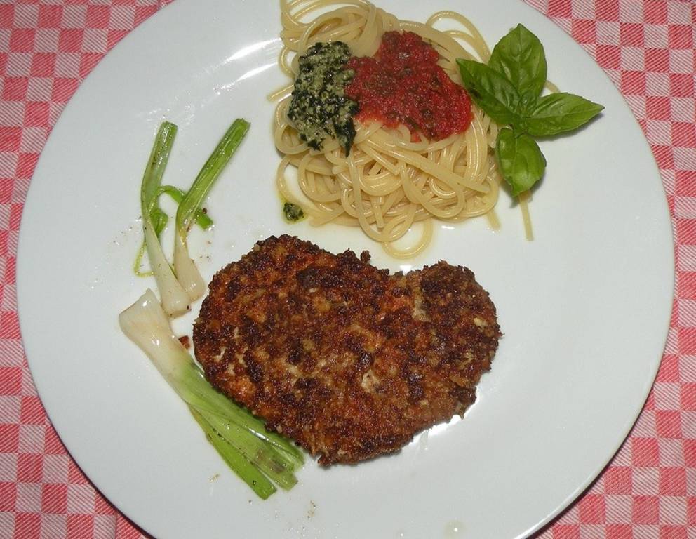 - Die letzte Minute die Zwiebel mitbraten. Nudeln abgießen und auf Tellern anrichten, mit heißer Paradeissoße und Pesto garnieren, panierte Koteletts und die Frühlingszwiebel ebenfalls darauf anrichten.
