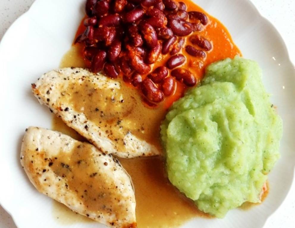 Zum Hühnerfilet mit Erdäpfel-Petersilpüree und Paprika-Kidneybohnen passt hervorragend ein gemischter Blattsalat. Statt dem Erdäpfel-Petersilpüree passt auch Selleriepüree oder einfaches Erdäpfelpüree.