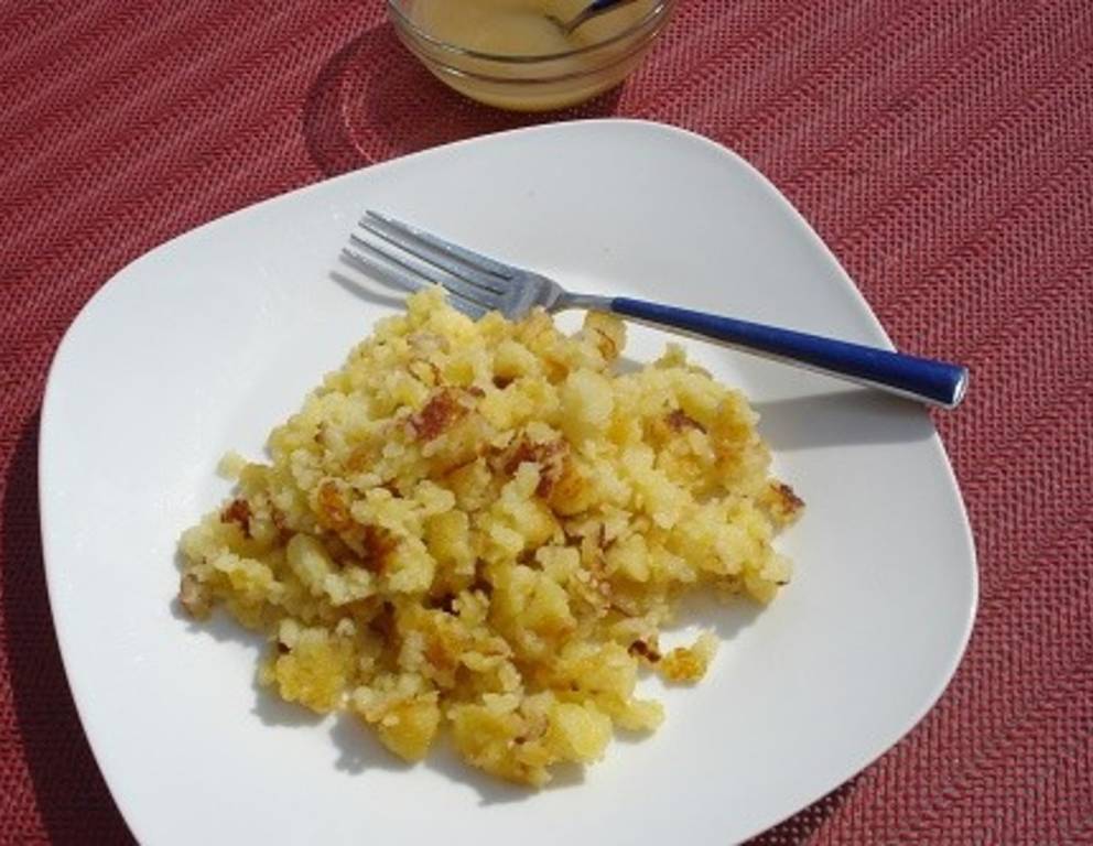 Selbst gemachtes Apfelmus schmeckt zum Erdäpfelriebel natürlich am besten. Ein gutes Rezept, wenn Erdäpfel vom Vortag übrig geblieben sind.