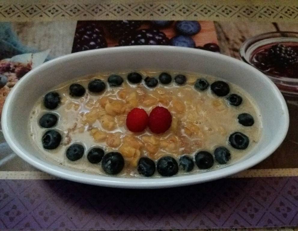 Statt der Heidelbeeren kann man auch anderes Obst für den Hafer-Soja-Dinkelbrei nehmen, auch getrocknete Beeren wie Gojibeeren und Cranberries, die man mitköcheln läßt, passen sehr gut.