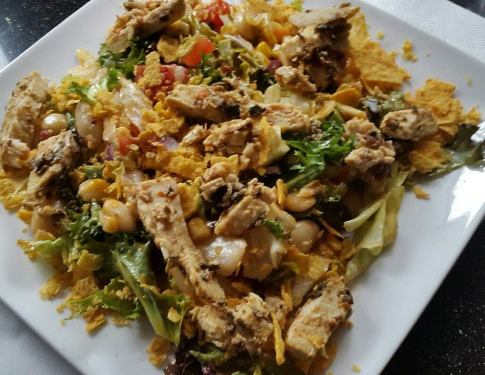 - Den Salat putzen und waschen, anschließend trocken schleudern. Anschließend den Salat mit allen anderen Zutaten (bis auf die Tortillas Chips) locker vermengen. Dressing zufügen und nochmals vorsichtig durchmengen.