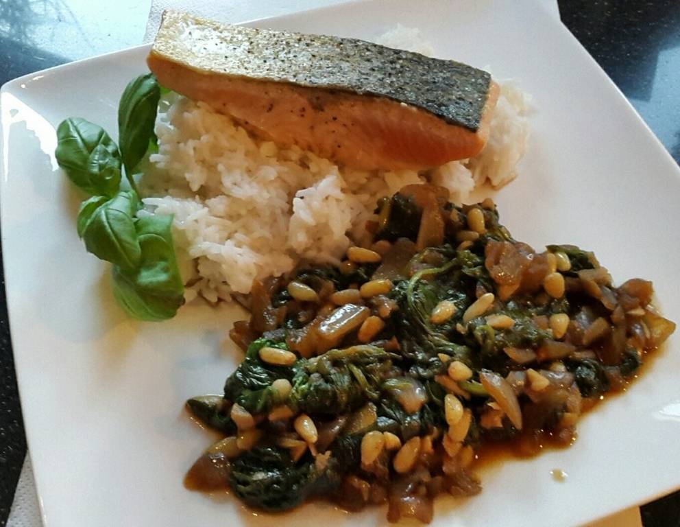 Orientalischer Spinat mit Lachs ist auch mit Basmatireis oder zur Not auch mit normalem Reis schmackhaft.