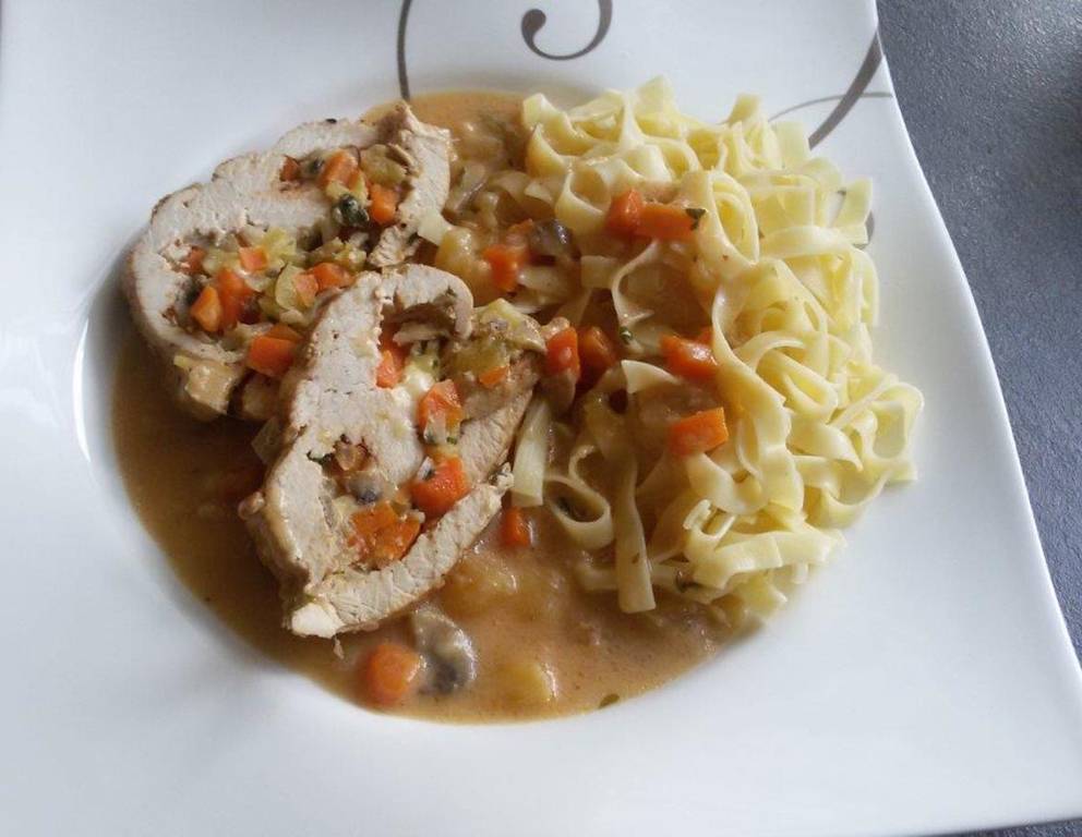 Zu Putenbrust mit Gemüse-Mozzarellafüllung passen gut Bandnudeln und grüner Salat.