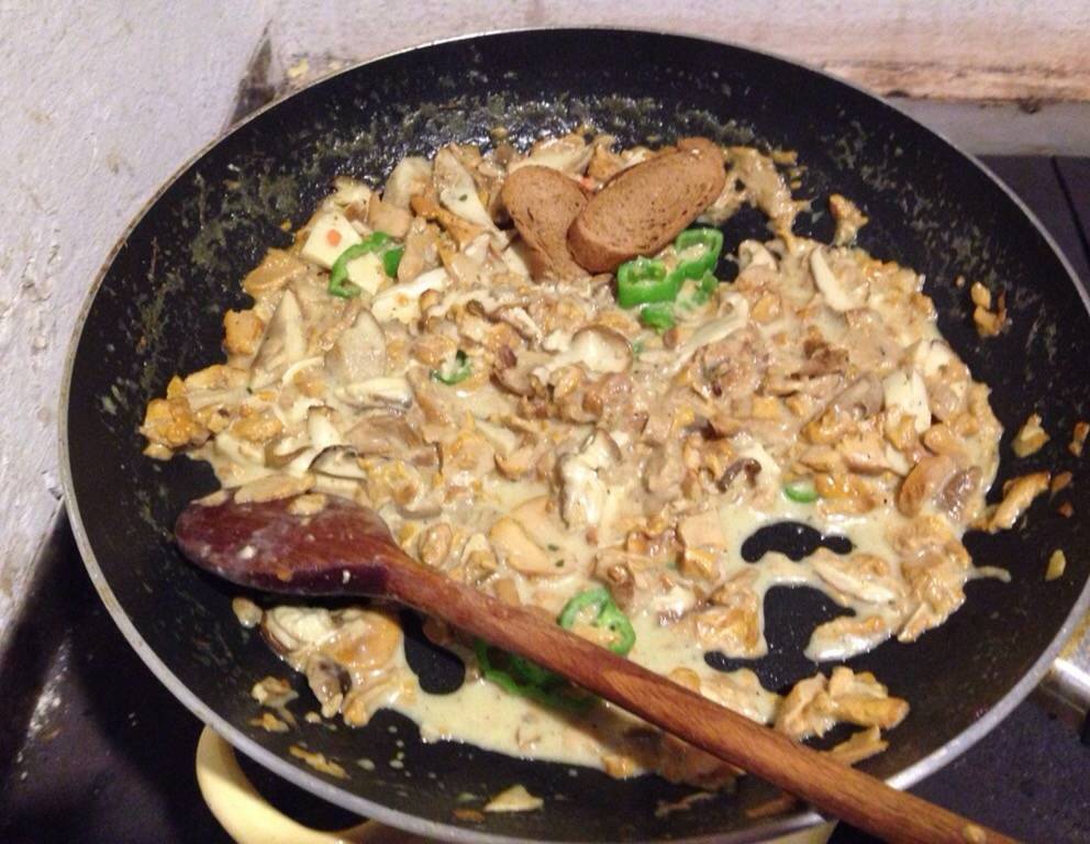 Wer möchte verfeinert die Eierschwammerlsauce noch zusätzlich mit etwas zerdrücktem Knoblauch.