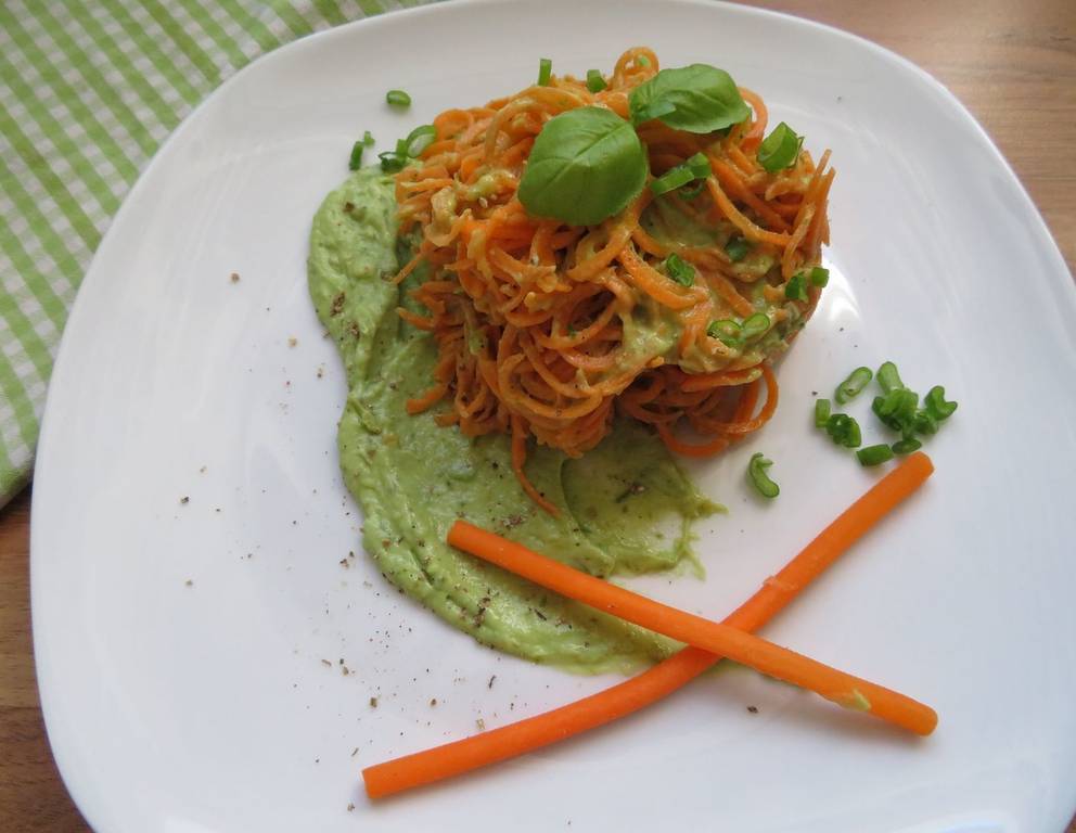 - Für die Karottini mit Avocado-Basilikumsugo die Karotten gut waschen und mit einem Spiralschneider in "Spaghettini" schneiden. In der Hälfte des Zitronensaftes marinieren, damit sie nicht braun werden.