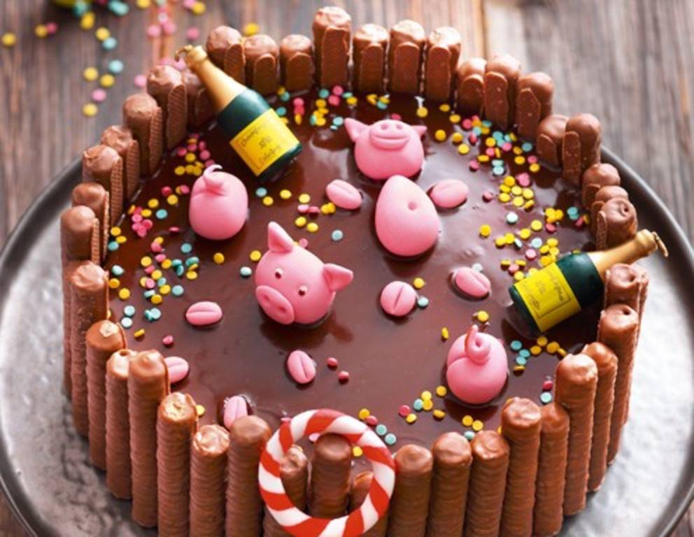 - Für die Oink, oink... Pool-Party Marzipanschweinchen-Torte zunächst den Backofen auf 180 °C vorheizen. Den Boden der Form mit Backpapier auslegen und den Rand einfetten. Für den Teig die Schokolade grob hacken und mit der Butter in einer Schüssel über dem heißen Wasserbad schmelzen. Danach abkühlen lassen. Eier und Zucker mit den Quirlen des Handrührgeräts hellschaumig aufschlagen. Mehl und Backpulver darübersieben und mit wenigen Umdrehungen des Rührgeräts untermischen. Schokobutter und Crème fraîche in zwei Portionen mit dem Teigschaber unterheben. Den Teig in die Form füllen, glatt streichen und im Ofen (Mitte) 35–40 Minuten backen. Herausnehmen, leicht abgekühlt aus der Form lösen und ganz auskühlen lassen.