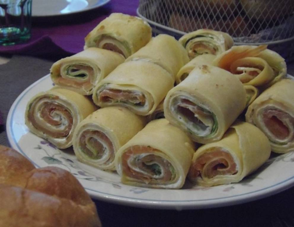 - Die Palatschinken mit Kräuterfrischkäse bestreichen, auf einer Hälfte mit Lachs und Salat belegen und einrollen. In ca. 4 - 5 cm lange Stücke schneiden.