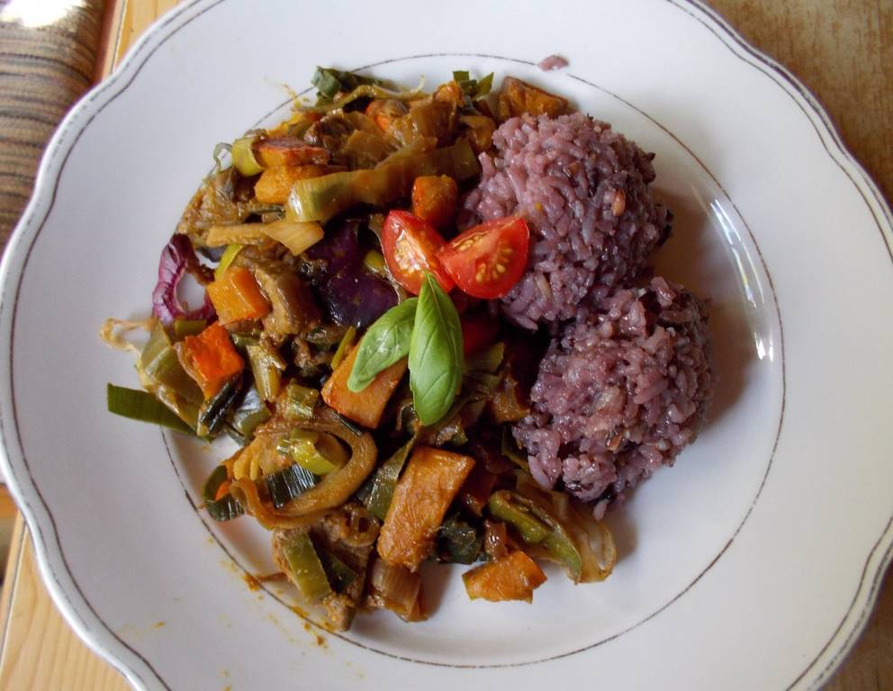 Der Kürbis-Lauch Wok mit Barberieente kann selbstverständlich auch mit weißem Reis serviert werden. Auch asiatische Eiernudeln passen sehr gut dazu.