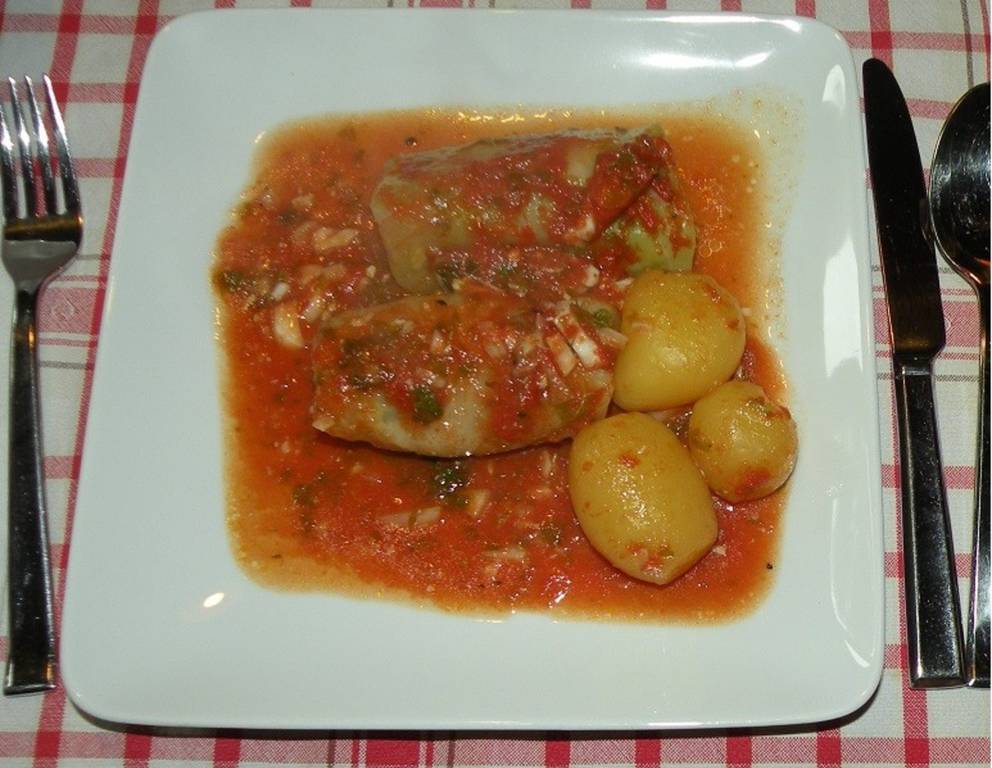 - Paradeissoße mit gehackter Petersilie und noch einem Viertel kleingehacktem Krautkopf mischen. In jedes Krautblatt einen großen EL voll Fülle einrollen.