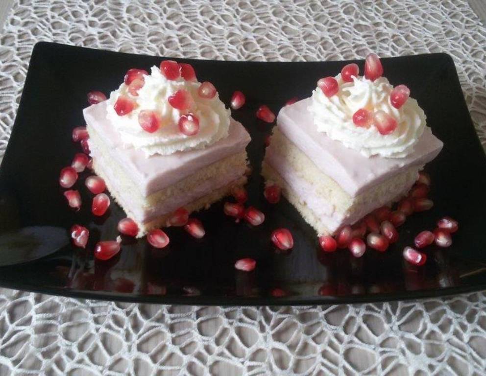 - In der Mitte auseinander schneiden und auf die andere Schicht legen. Nun die Törtchen in Würfelform schneiden. Schlagobers mit Sahnesteif und Vanillezucker steif schlagen und verzieren.