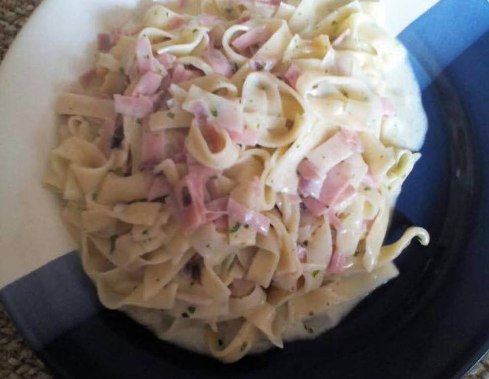 - Für die Tagliatelle a la Carbonara die Tagliatelle bissfest kochen, abseihen. Für die Sauce den würfelig geschnittenen Zwiebel in einer Pfanne mit Öl anschwitzen. Schinken in feine Streifen schneiden und mit dem Zwiebel anrösten.