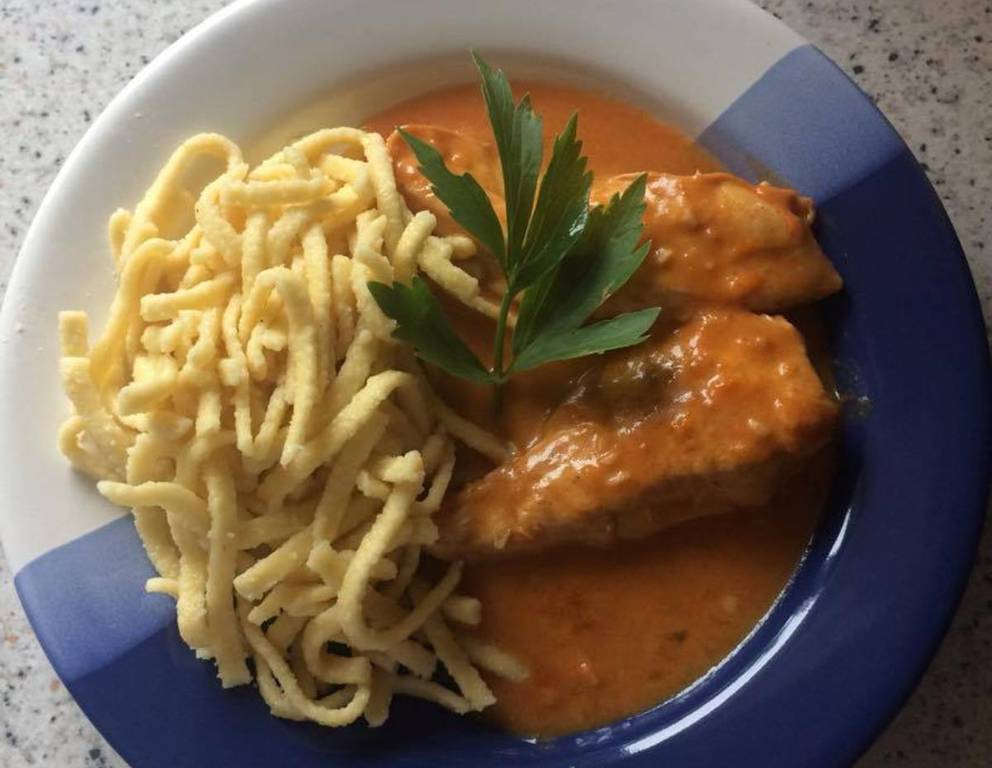 - Anschließend das Filet dazugeben und in der Sauce ca. 15 Minuten köcheln lassen.  Zum Schluss mit Schlagobers verfeinern.