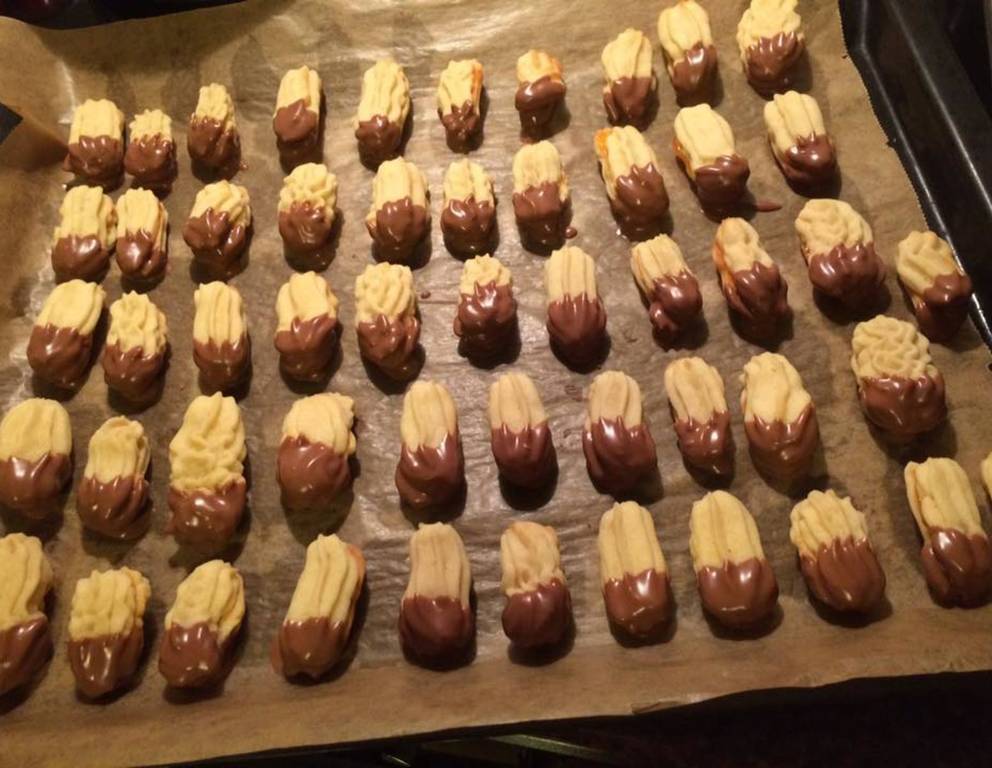 - Marzipan und Butter Zimmertemperatur annehmen lassen und mit Staubzucker schaumig rühren. Vanillezucker, Salz, geriebene Zitronenschale zugeben und nach und nach Eiklar einrühren. Zuletzt das gesiebte Mehl mit einer Gummispachtel oder Kochlöffel unterheben. Masse in einen Spritzbeutel füllen und auf ein mit Backtrennpapier ausgelegtes Backblech kleine Muscheln dressieren. Im vorgeheizten Backrohr bei 170°C ca. 14 Minuten backen. Jeweils eine Muschel mit heller Marmelade füllen, zweite Muschel darauf setzen und in geschmolzene Schokolade bzw. Kuvertüre zu einem Drittel eintauchen. Trocknen lassen.
