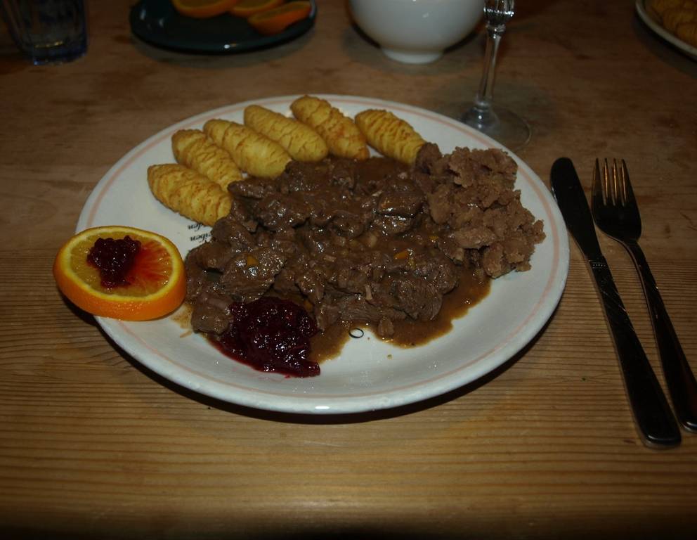- Hirschfleisch würfelig schneiden mit Wacholdersalz und Pfeffer würzen - dazugeben und scharf anbraten. Die Orange in Scheiben schneiden, zur Seite legen. Nur die beiden Endstücke sehr klein hacken und mit dem Hirschfleisch anbraten. Tomatenmark einrühren.