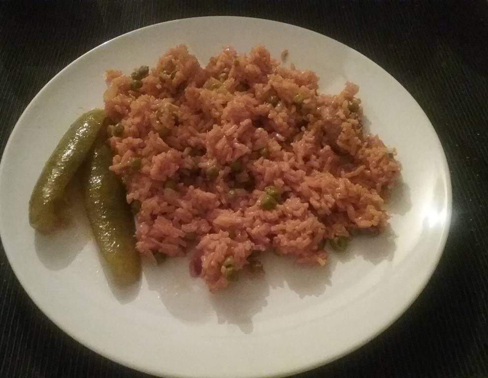 - Das Fleisch anbraten und den Esslöffel Tomatenmark beimengen. Mit Wasser aufgießen den Reis und die Erbsen hineingeben sowie den Suppenwürfel.