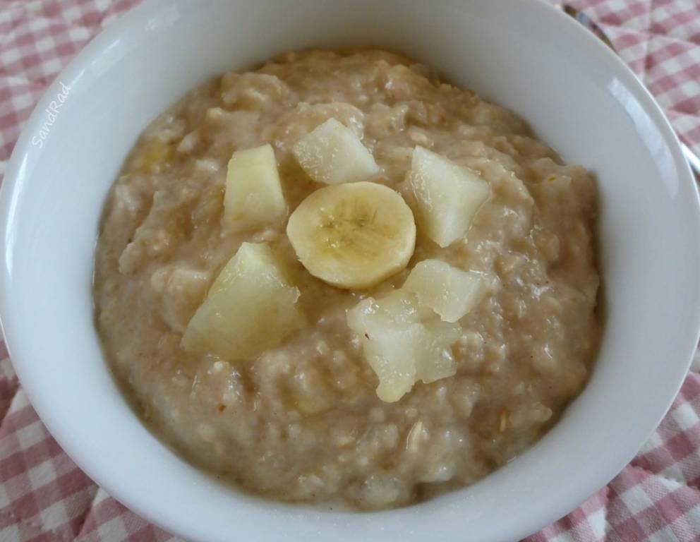 - Gelegentlich umrühren damit sich nichts anlegt.   Die Banane mit der Gabel zerdrücken und in den fast fertigen Porridge einrühren und noch kurz durchziehen lassen.