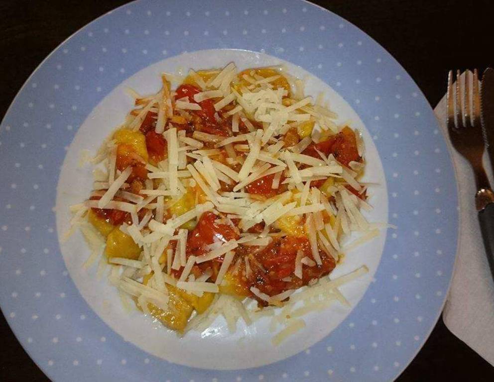 - Im aufkochendem Salzwasser ziehen lassen.  Wenn Sie an die Oberfläche steigen,  abseihen. Gnocchi in Butterschmalz beidseitig anbraten.  Inzwischen die Paradeiser in Olivenöl abschmelzen  .