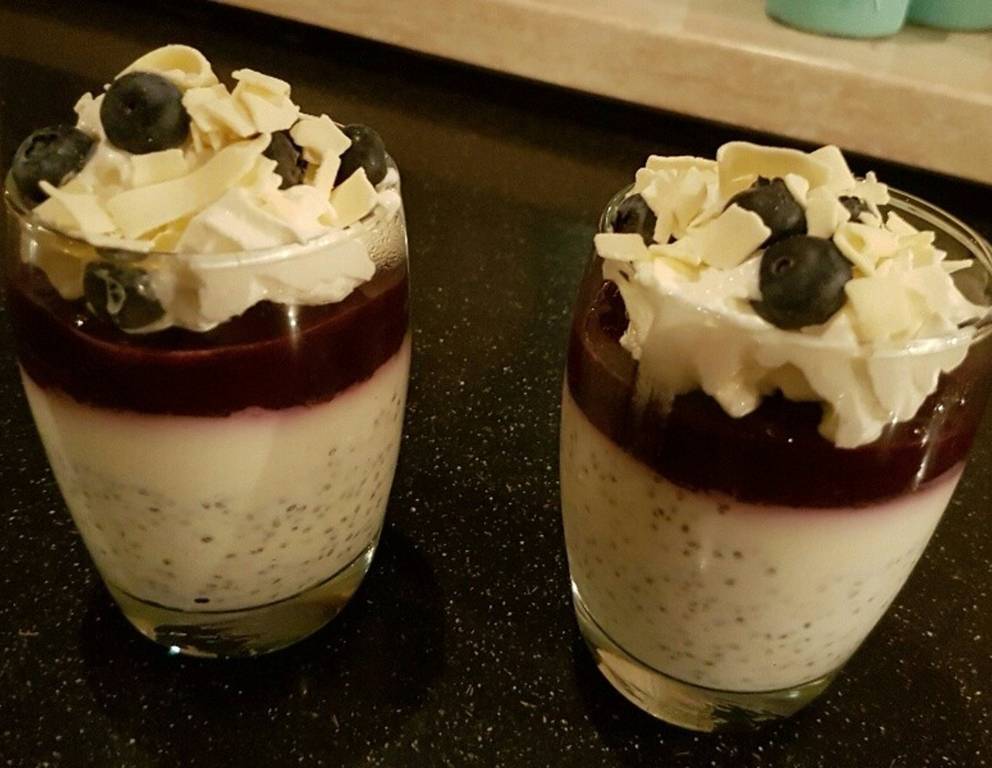 - Anschließend in 4 Dessertgläser füllen, diese mit Frischhaltefolie abdecken und über Nacht kühl stellen.